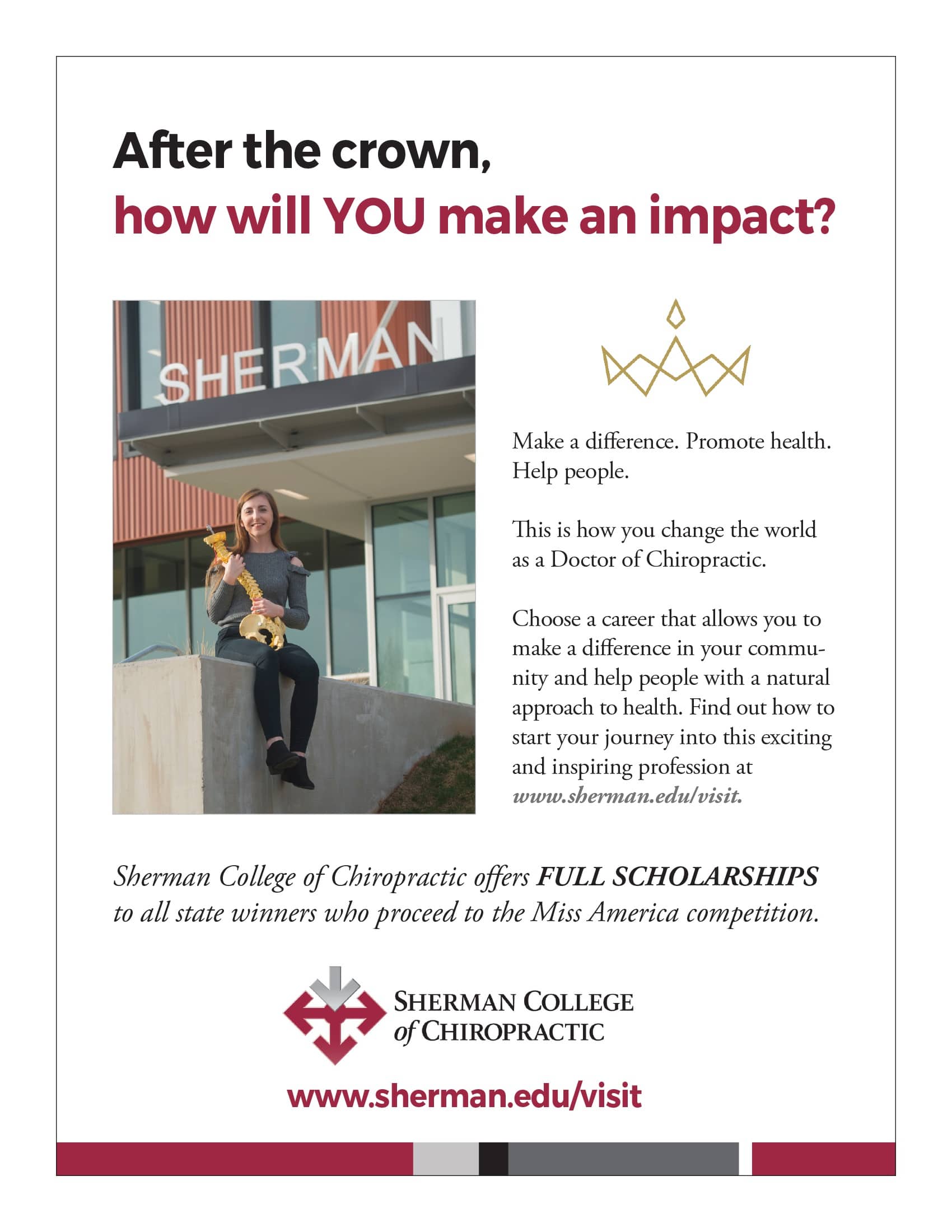 Sherman College opens the door to the chiropractic profession for young women by annually donating a full-tuition scholarship to each of the 51 national candidates in the Miss America Organization. This award is available to any state competition winner within the Miss America Organization who advances to compete in the 2020 Miss America Competition.