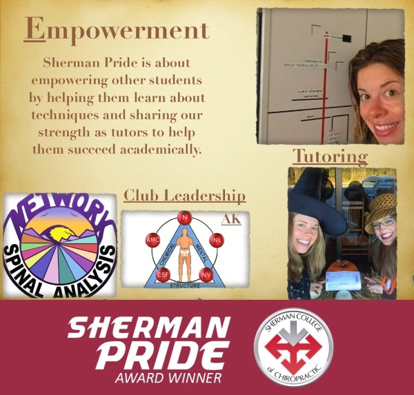 To be considered for the Pride Awards, students were asked to show how they share or exemplify Sherman Pride in their lives, using words, photos or videos. They were encouraged to be simple, direct and heartfelt in their submissions, which could show Sherman Pride in the local community; in students’ hometowns; as interns in the on-campus Chiropractic Health Center; via essay, poem or song; or however best expressed their school spirit. The winners submitted photos, presentations, videos, poems, and even a song performance.