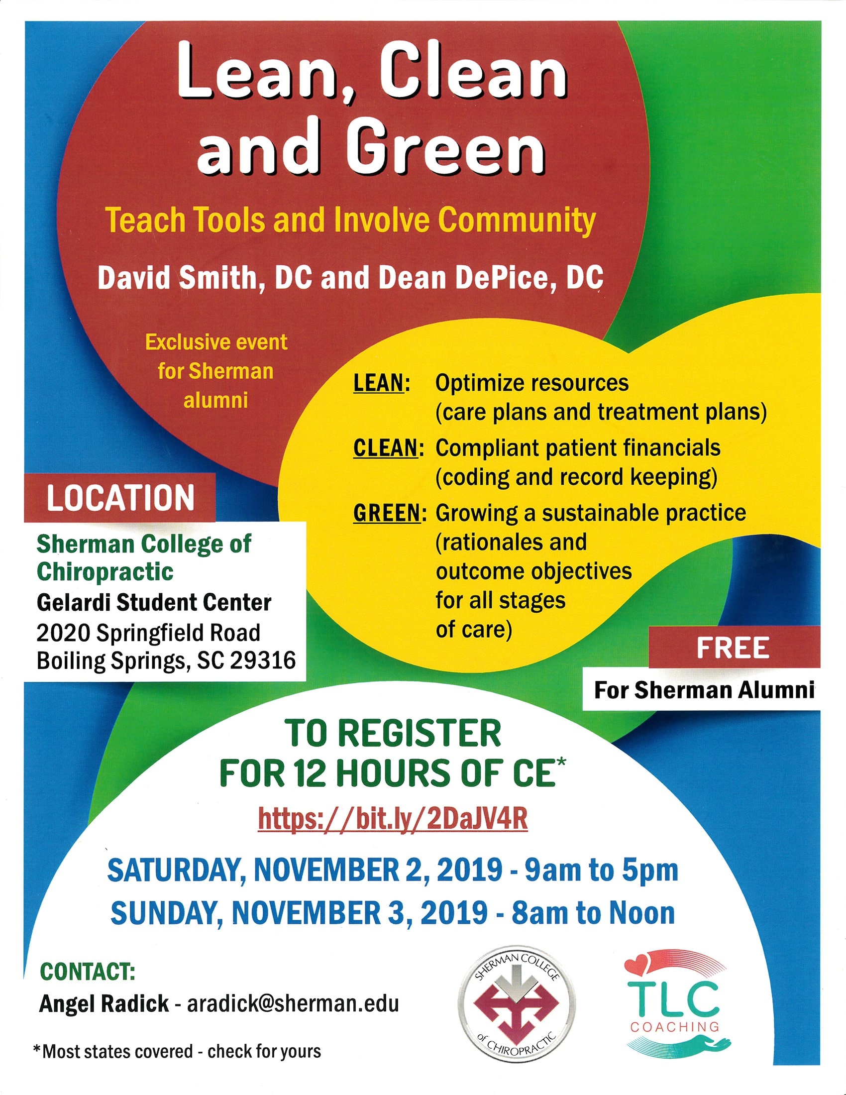 Because alumni showed an overwhelming interest in Sherman College’s Graduation Plus 10 (G10) practice success curriculum after hearing about Sherman’s partnership with TLC, Sherman College is gifting TLC’s Lean, Clean and Green program to alumni!