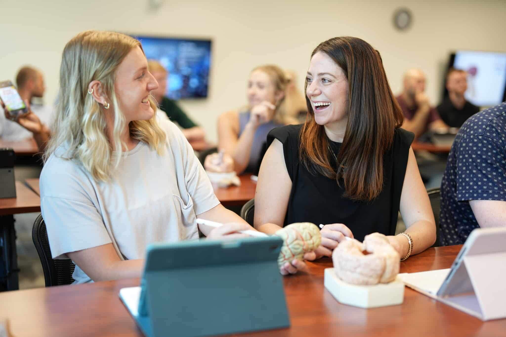 Two students in class smiling and talking